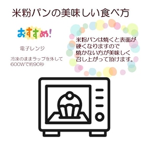 冷凍状態でのお届けとなりますので、食べたい分だけを取り出し、自然解凍もしくは、ラップを外してレンジで90秒程度温めて頂きますと、ふんわりとした食感が楽しめます。軽く温めることで、米粉の香ばしさが際立ちます。