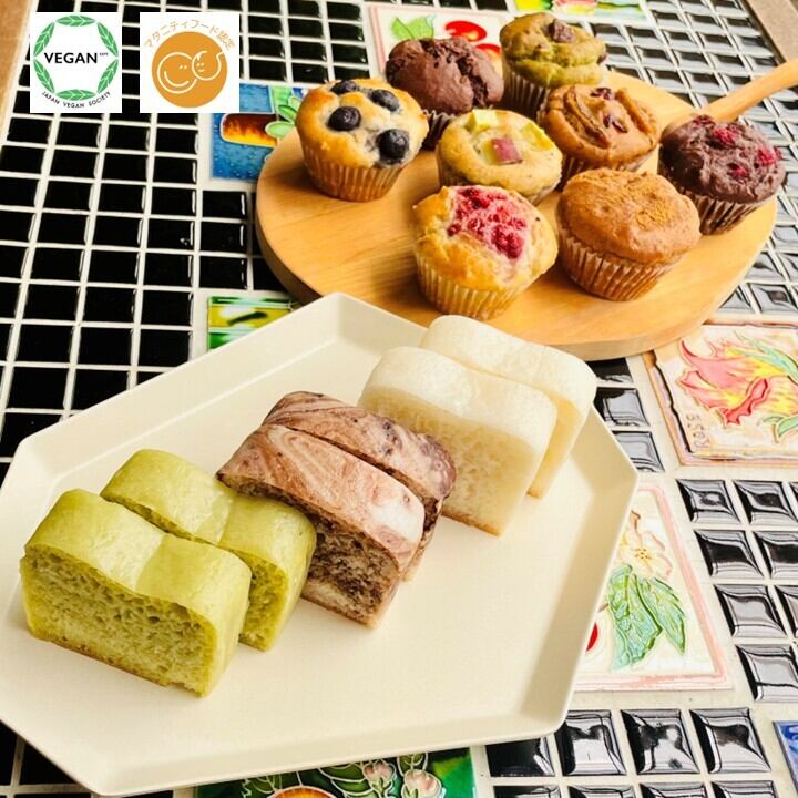 ■チョコラズベリー:米粉(福岡産)、バナナ(有機栽培)、豆乳(無調整、大豆(国産))、素焚糖(ヴィーガン)、菜種油(平田産業)、ラズベリー、オーガニックアガベシロップ、アーモンドプードル、ココアパウダー、有機レモン果汁、塩(またいちの塩)/ベーキングパウダー(アルミフリー)、重曹