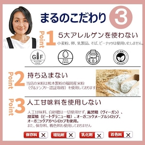 この米粉まるパンは、グルテンフリーであり、卵や乳製品、動物性食品は一切使用していません。安心してお召し上がりいただける、自然な素材を使用しています。米粉ならではのモチモチとした食感と、香ばしい風味が特徴です。