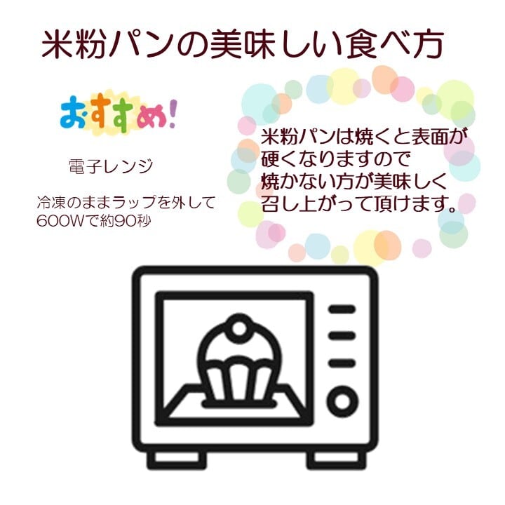 冷凍状態でのお届けとなりますので、食べたい分だけを取り出し、自然解凍もしくは、ラップを外してレンジで90秒程度温めて頂きますと、ふんわりとした食感が楽しめます。軽く温めることで、米粉の香ばしさが際立ちます。